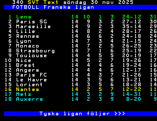 FOTBOLL Franska ligan 1 Lens 14 10 1 3 24-12 31 2 Paris SG 14 9 3 2 27-12 30 3 Marseille 14 9 2 3 35-14 29 4 Lille 14 8 2 4 28-17 26 5 Rennes 14 6 6 2 24-18 24 6 Lyon 14 7 3 4 21-15 24 7 Monaco 14 7 2 5 26-25 23 8 Strasbourg 14 7 1 6 25-19 22 9 Toulouse 14 4 5 5 20-19 17 10 Nice 14 5 2 7 19-26 17 11 Brest 14 4 4 6 19-24 16 12 Angers 14 4 4 6 12-17 16 13 Paris FC 14 4 3 7 21-26 15 14 Le Havre 14 3 5 6 13-21 14 15 Lorient 14 3 5 6 18-28 14 16 Nantes 14 2 5 7 12-22 11 17 Metz 14 3 2 9 14-31 11 18 Auxerre 14 2 3 9 8-20 9 Tyska ligan följer >>> +Dela 3 dagar