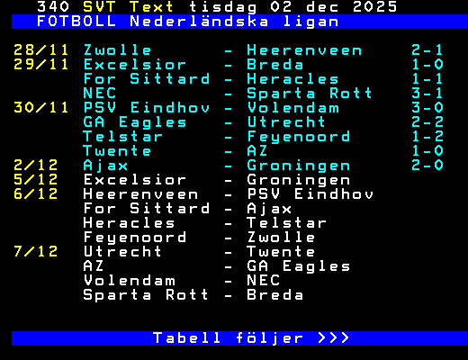 FOTBOLL Nederländska ligan 28/11 Zwolle - Heerenveen 2-1 29/11 Excelsior - Breda 1-0 For Sittard - Heracles 1-1 NEC - Sparta Rott 3-1 30/11 PSV Eindhov - Volendam 3-0 GA Eagles - Utrecht 2-2 Telstar - Feyenoord 1-2 Twente - AZ 1-0 2/12 Ajax - Groningen 2-0 5/12 Excelsior - Groningen 6/12 Heerenveen - PSV Eindhov For Sittard - Ajax Heracles - Telstar Feyenoord - Zwolle 7/12 Utrecht - Twente AZ - GA Eagles Volendam - NEC Sparta Rott - Breda Tabell följer >>> +Dela 1 dag