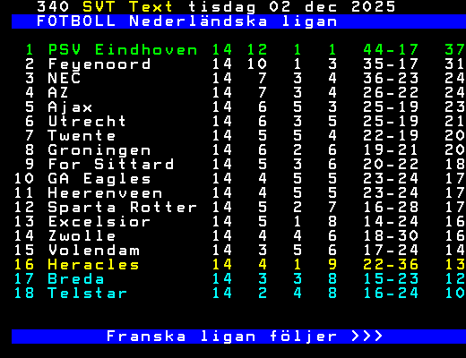 FOTBOLL Nederländska ligan 1 PSV Eindhoven 14 12 1 1 44-17 37 2 Feyenoord 14 10 1 3 35-17 31 3 NEC 14 7 3 4 36-23 24 4 AZ 14 7 3 4 26-22 24 5 Ajax 14 6 5 3 25-19 23 6 Utrecht 14 6 3 5 25-19 21 7 Twente 14 5 5 4 22-19 20 8 Groningen 14 6 2 6 19-21 20 9 For Sittard 14 5 3 6 20-22 18 10 GA Eagles 14 4 5 5 23-24 17 11 Heerenveen 14 4 5 5 23-24 17 12 Sparta Rotter 14 5 2 7 16-28 17 13 Excelsior 14 5 1 8 14-24 16 14 Zwolle 14 4 4 6 18-30 16 15 Volendam 14 3 5 6 17-24 14 16 Heracles 14 4 1 9 22-36 13 17 Breda 14 3 3 8 15-23 12 18 Telstar 14 2 4 8 16-24 10 Franska ligan följer >>> +Dela 1 dag