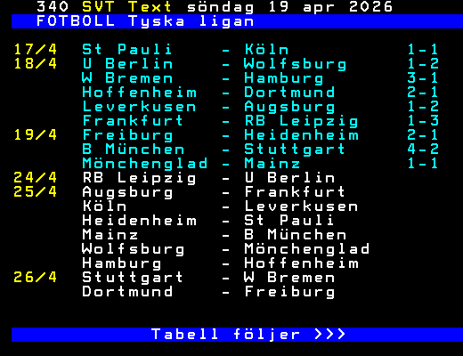 FOTBOLL Tyska ligan 17/4 St Pauli - Köln 1-1 18/4 U Berlin - Wolfsburg 1-2 W Bremen - Hamburg 3-1 Hoffenheim - Dortmund 2-1 Leverkusen - Augsburg 1-2 Frankfurt - RB Leipzig 1-3 19/4 Freiburg - Heidenheim 2-1 B München - Stuttgart 4-2 Mönchenglad - Mainz 1-1 24/4 RB Leipzig - U Berlin 25/4 Augsburg - Frankfurt Köln - Leverkusen Heidenheim - St Pauli Mainz - B München Wolfsburg - Mönchenglad Hamburg - Hoffenheim 26/4 Stuttgart - W Bremen Dortmund - Freiburg Tabell följer >>> +Dela 3 dagar