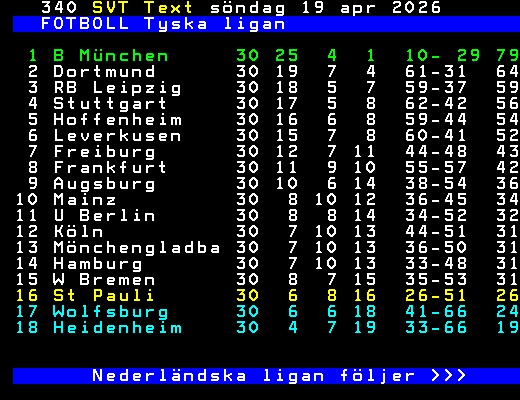 FOTBOLL Tyska ligan 1 B München 30 25 4 1 10- 29 79 2 Dortmund 30 19 7 4 61-31 64 3 RB Leipzig 30 18 5 7 59-37 59 4 Stuttgart 30 17 5 8 62-42 56 5 Hoffenheim 30 16 6 8 59-44 54 6 Leverkusen 30 15 7 8 60-41 52 7 Freiburg 30 12 7 11 44-48 43 8 Frankfurt 30 11 9 10 55-57 42 9 Augsburg 30 10 6 14 38-54 36 10 Mainz 30 8 10 12 36-45 34 11 U Berlin 30 8 8 14 34-52 32 12 Köln 30 7 10 13 44-51 31 13 Mönchengladba 30 7 10 13 36-50 31 14 Hamburg 30 7 10 13 33-48 31 15 W Bremen 30 8 7 15 35-53 31 16 St Pauli 30 6 8 16 26-51 26 17 Wolfsburg 30 6 6 18 41-66 24 18 Heidenheim 30 4 7 19 33-66 19 Nederländska ligan följer >>> +Dela 3 dagar