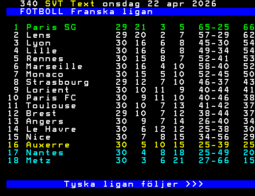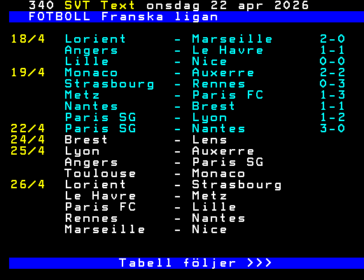SVT Text Ons 22 Apr. 2026 FOTBOLL Franska ligan 18/4 Lorient - Marseille 2-0 Angers - Le Havre 1-1 Lille - Nice 0-0 19/4 Monaco - Auxerre 2-2 Strasbourg - Rennes 0-3 Metz - Paris FC 1-3 Nantes - Brest 1-1 Paris SG - Lyon 1-2 22/4 Paris SG - Nantes 3-0 24/4 Brest - Lens 25/4 Lyon - Auxerre Angers - Paris SG Toulouse - Monaco 26/4 Lorient - Strasbourg Le Havre - Metz Paris FC - Lille Rennes - Nantes Marseille - Nice Tabell följer >>> +Dela Igår 21:00
