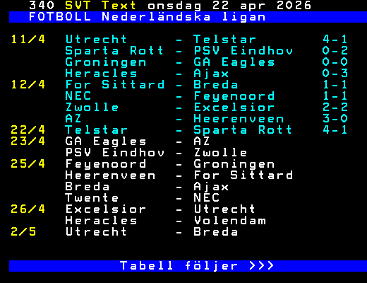 FOTBOLL Nederländska ligan 11/4 Utrecht - Telstar 4-1 Sparta Rott - PSV Eindhov 0-2 Groningen - GA Eagles 0-0 Heracles - Ajax 0-3 12/4 For Sittard - Breda 1-1 NEC - Feyenoord 1-1 Zwolle - Excelsior 2-2 AZ - Heerenveen 3-0 22/4 Telstar - Sparta Rott 4-1 23/4 GA Eagles - AZ PSV Eindhov - Zwolle 25/4 Feyenoord - Groningen Heerenveen - For Sittard Breda - Ajax Twente - NEC 26/4 Excelsior - Utrecht Heracles - Volendam 2/5 Utrecht - Breda Tabell följer >>> +Dela Igår 22:00