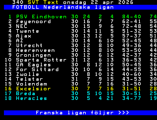 FOTBOLL Nederländska ligan 1 PSV Eindhoven 30 24 2 4 84-40 74 2 Feyenoord 30 16 7 7 62-41 55 3 NEC 30 15 9 6 72-48 54 4 Twente 30 14 11 5 51-32 53 5 Ajax 30 13 12 5 57-37 51 6 AZ 30 14 6 10 52-45 48 7 Utrecht 30 12 8 10 49-36 44 8 Heerenveen 30 12 8 10 53-50 44 9 Groningen 30 12 6 12 42-37 42 10 Sparta Rotter 31 12 6 13 36-53 42 11 GA Eagles 30 8 12 10 50-45 36 12 For Sittard 30 10 6 14 44-55 36 13 Zwolle 30 8 10 12 40-60 34 14 Telstar 31 7 9 15 43-53 30 15 Volendam 30 7 7 16 31-50 28 16 Excelsior 30 7 7 16 31-51 28 17 Breda 30 5 10 15 30-51 25 18 Heracles 30 5 4 21 34-77 19 Franska ligan följer >>> +Dela Igår 22:00