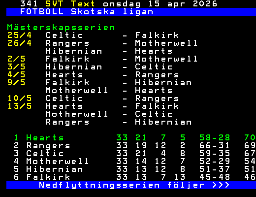 FOTBOLL Skotska ligan Mästerskapsserien 25/4 Celtic - Falkirk 26/4 Rangers - Motherwell Hibernian - Hearts 2/5 Falkirk - Motherwell 3/5 Hibernian - Celtic 4/5 Hearts - Rangers 9/5 Falkirk - Hibernian Motherwell - Hearts 10/5 Celtic - Rangers 13/5 Hearts - Falkirk Motherwell - Celtic Rangers - Hibernian 1 Hearts 33 21 7 5 58-28 70 2 Rangers 33 19 12 2 66-31 69 3 Celtic 33 21 4 8 59-35 67 4 Motherwell 33 14 12 7 52-29 54 5 Hibernian 33 13 12 8 51-37 51 6 Falkirk 33 13 7 13 45-48 46 Nedflyttningsserien följer >>> +Dela 7 dagar