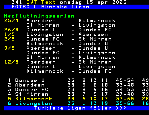 FOTBOLL Skotska ligan Nedflyttningsserien 25/4 Aberdeen - Kilmarnock St Mirren - Livingston 26/4 Dundee U - Dundee FC 1/5 Livingston - Aberdeen 2/5 Dundee FC - St Mirren Kilmarnock - Dundee U 9/5 Aberdeen - Dundee U Dundee FC - Livingston St Mirren - Kilmarnock 12/5 Aberdeen - St Mirren Dundee U - Livingston Kilmarnock - Dundee FC 1 Dundee U 33 9 13 11 45-54 40 2 Aberdeen 33 9 6 18 33-48 33 3 Dundee FC 33 8 9 16 34-53 33 4 St Mirren 33 7 9 17 27-48 30 5 Kilmarnock 33 6 10 17 37-65 28 6 Livingston 33 1 13 19 35-66 16 Turkiska ligan följer >>> +Dela 7 dagar