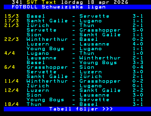 FOTBOLL Schweiziska ligan 15/3 Basel - Servette 3-1 17/3 Sankt Galle - Lugano 1-1 21/3 Zürich - Thun 2-1 Servette - Grasshopper 5-0 Sion - Sankt Galle 1-1 22/3 Wintherthur - Basel 0-2 Luzern - Lausanne 4-0 Young Boys - Lugano 1-1 4/4 Lugano - Thun 1-0 Lausanne - Wintherthur 2-1 Basel - Young Boys 3-3 6/4 Grasshopper - Sion 0-4 Servette - Luzern 3-0 Sankt Galle - Zürich 2-1 11/4 Wintherthur - Grasshopper 0-2 Zürich - Lugano 0-1 12/4 Luzern - Sankt Galle 2-2 Sion - Lausanne 3-0 Young Boys - Servette 1-1 18/4 Thun - Basel 3-1 Tabell följer >>> +Dela 4 dagar