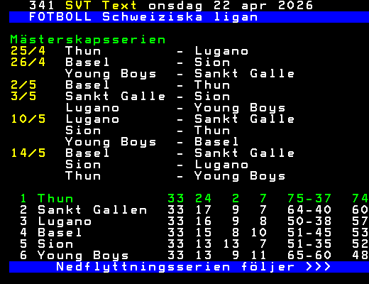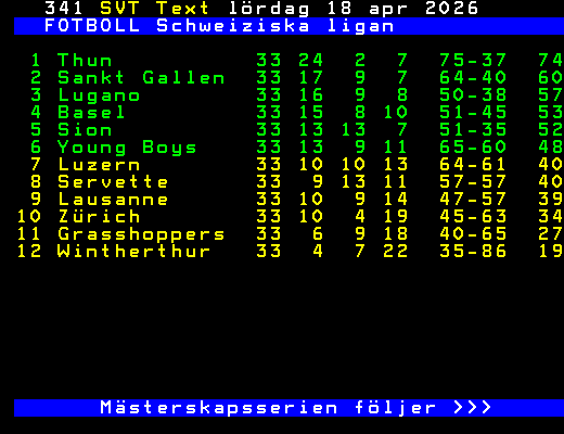 FOTBOLL Schweiziska ligan 1 Thun 33 24 2 7 75-37 74 2 Sankt Gallen 33 17 9 7 64-40 60 3 Lugano 33 16 9 8 50-38 57 4 Basel 33 15 8 10 51-45 53 5 Sion 33 13 13 7 51-35 52 6 Young Boys 33 13 9 11 65-60 48 7 Luzern 33 10 10 13 64-61 40 8 Servette 33 9 13 11 57-57 40 9 Lausanne 33 10 9 14 47-57 39 10 Zürich 33 10 4 19 45-63 34 11 Grasshoppers 33 6 9 18 40-65 27 12 Wintherthur 33 4 7 22 35-86 19 Mästerskapsserien följer >>> +Dela 4 dagar