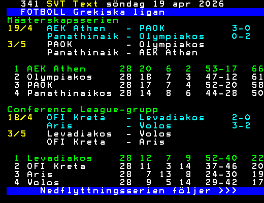 FOTBOLL Grekiska ligan Mästerskapsserien 19/4 AEK Athen - PAOK 3-0 Panathinaik - Olympiakos 0-2 3/5 PAOK - Olympiakos Panathinaik - AEK Athen 1 AEK Athen 28 20 6 2 53-17 66 2 Olympiakos 28 18 7 3 47-12 61 3 PAOK 28 17 7 4 52-20 58 4 Panathinaikos 28 14 8 6 44-28 50 Conference League-grupp 18/4 OFI Kreta - Levadiakos 2-0 Aris - Volos 3-2 3/5 Levadiakos - Volos OFI Kreta - Aris 1 Levadiakos 28 12 7 9 52-40 22 2 OFI Kreta 28 11 3 14 37-46 20 3 Aris 28 7 13 8 24-30 19 4 Volos 28 9 5 14 29-42 17 Nedflyttningsserien följer >>> +Dela 3 dagar