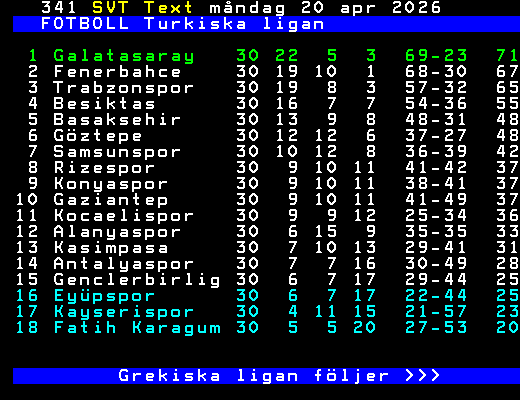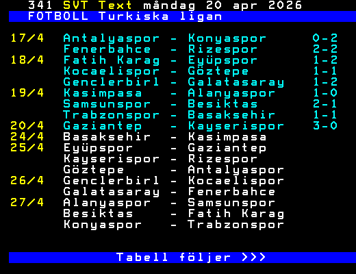 SVT Text Mån 20 Apr. 2026 FOTBOLL Turkiska ligan 17/4 Antalyaspor - Konyaspor 0-2 Fenerbahce - Rizespor 2-2 18/4 Fatih Karag - Eyüpspor 1-2 Kocaelispor - Göztepe 1-1 Genclerbirl - Galatasaray 1-2 19/4 Kasimpasa - Alanyaspor 1-0 Samsunspor - Besiktas 2-1 Trabzonspor - Basaksehir 1-1 20/4 Gaziantep - Kayserispor 3-0 24/4 Basaksehir - Kasimpasa 25/4 Eyüpspor - Gaziantep Kayserispor - Rizespor Göztepe - Antalyaspor 26/4 Genclerbirl - Kocaelispor Galatasaray - Fenerbahce 27/4 Alanyaspor - Samsunspor Besiktas - Fatih Karag Konyaspor - Trabzonspor Tabell följer >>> +Dela 2 dagar