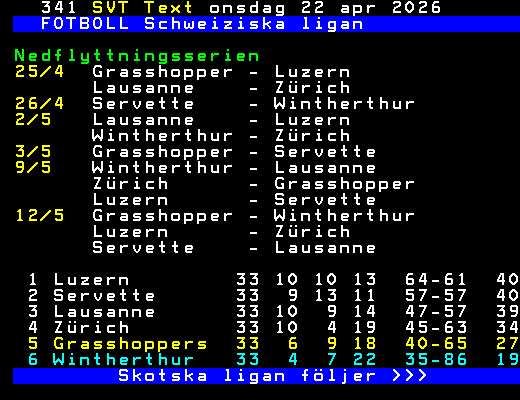 FOTBOLL Schweiziska ligan Nedflyttningsserien 25/4 Grasshopper - Luzern Lausanne - Zürich 26/4 Servette - Wintherthur 2/5 Lausanne - Luzern Wintherthur - Zürich 3/5 Grasshopper - Servette 9/5 Wintherthur - Lausanne Zürich - Grasshopper Luzern - Servette 12/5 Grasshopper - Wintherthur Luzern - Zürich Servette - Lausanne 1 Luzern 33 10 10 13 64-61 40 2 Servette 33 9 13 11 57-57 40 3 Lausanne 33 10 9 14 47-57 39 4 Zürich 33 10 4 19 45-63 34 5 Grasshoppers 33 6 9 18 40-65 27 6 Wintherthur 33 4 7 22 35-86 19 Skotska ligan följer >>> +Dela Igår 07:45