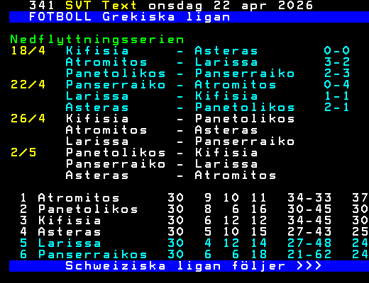 FOTBOLL Grekiska ligan Nedflyttningsserien 18/4 Kifisia - Asteras 0-0 Atromitos - Larissa 3-2 Panetolikos - Panserraiko 2-3 22/4 Panserraiko - Atromitos 0-4 Larissa - Kifisia 1-1 Asteras - Panetolikos 2-1 26/4 Kifisia - Panetolikos Atromitos - Asteras Larissa - Panserraiko 2/5 Panetolikos - Kifisia Panserraiko - Larissa Asteras - Atromitos 1 Atromitos 30 9 10 11 34-33 37 2 Panetolikos 30 8 6 16 30-45 30 3 Kifisia 30 6 12 12 34-45 30 4 Asteras 30 5 10 15 27-43 25 5 Larissa 30 4 12 14 27-48 24 6 Panserraikos 30 6 6 18 21-62 24 Schweiziska ligan följer >>> +Dela Igår 21:00