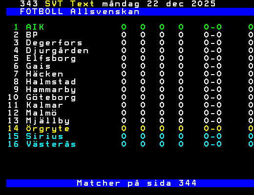 SVT Text Mån 22 Dec. 2025 FOTBOLL Allsvenskan 1 AIK 0 0 0 0 0-0 0 2 BP 0 0 0 0 0-0 0 3 Degerfors 0 0 0 0 0-0 0 4 Djurgården 0 0 0 0 0-0 0 5 Elfsborg 0 0 0 0 0-0 0 6 Gais 0 0 0 0 0-0 0 7 Häcken 0 0 0 0 0-0 0 8 Halmstad 0 0 0 0 0-0 0 9 Hammarby 0 0 0 0 0-0 0 10 Göteborg 0 0 0 0 0-0 0 11 Kalmar 0 0 0 0 0-0 0 12 Malmö 0 0 0 0 0-0 0 13 Mjällby 0 0 0 0 0-0 0 14 Örgryte 0 0 0 0 0-0 0 15 Sirius 0 0 0 0 0-0 0 16 Västerås 0 0 0 0 0-0 0 Matcher på sida 344 +Dela 74 dagar