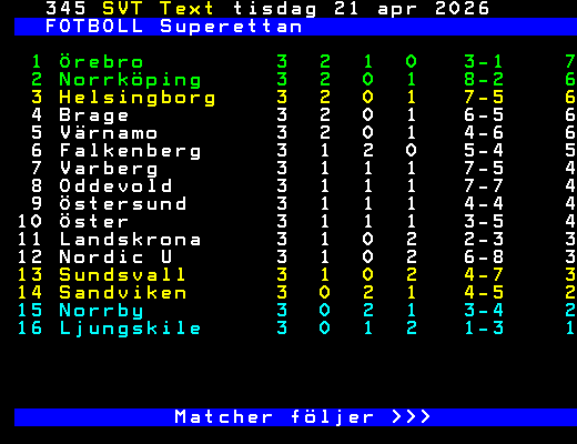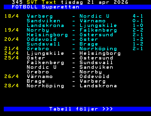 SVT Text Tis 21 Apr. 2026 FOTBOLL Superettan 18/4 Varberg - Nordic U 4-1 Sandviken - Värnamo 0-1 Landskrona - Ljungskile 1-0 19/4 Norrby - Falkenberg 2-2 Helsingborg - Östersund 2-1 20/4 Oddevold - Öster 1-2 Sundsvall - Brage 1-2 21/4 Örebro - Norrköping 2-1 24/4 Ljungskile - Helsingborg 25/4 Öster - Östersund Falkenberg - Sundsvall Nordic U - Sandviken Örebro - Norrby 26/4 Värnamo - Oddevold Brage - Varberg 28/4 Norrköping - Landskrona Tabell följer >>> +Dela 1 dag