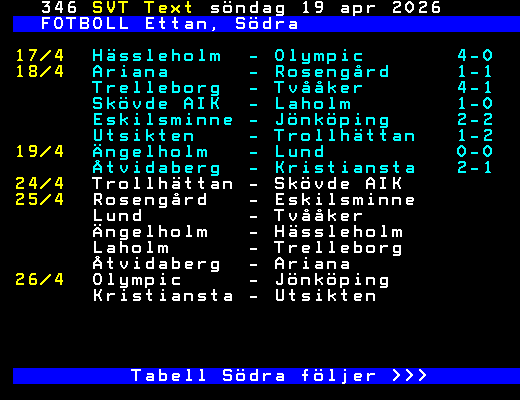 FOTBOLL Ettan, Södra 17/4 Hässleholm - Olympic 4-0 18/4 Ariana - Rosengård 1-1 Trelleborg - Tvååker 4-1 Skövde AIK - Laholm 1-0 Eskilsminne - Jönköping 2-2 Utsikten - Trollhättan 1-2 19/4 Ängelholm - Lund 0-0 Åtvidaberg - Kristiansta 2-1 24/4 Trollhättan - Skövde AIK 25/4 Rosengård - Eskilsminne Lund - Tvååker Ängelholm - Hässleholm Laholm - Trelleborg Åtvidaberg - Ariana 26/4 Olympic - Jönköping Kristiansta - Utsikten Tabell Södra följer >>> +Dela 3 dagar