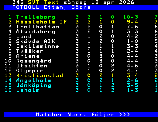 FOTBOLL Ettan, Södra 1 Trelleborg 3 2 1 0 10-3 7 2 Hässleholm IF 3 2 1 0 9-4 7 3 Trollhättan 3 2 0 1 7-6 6 4 Åtvidaberg 3 2 0 1 3-3 6 5 Lund 3 1 2 0 4-2 5 6 Skövde AIK 3 1 2 0 1-0 5 7 Eskilsminne 3 1 1 1 3-3 4 8 Tvååker 3 1 1 1 2-4 4 9 Ariana 3 0 3 0 4-4 3 10 Rosengård 3 0 3 0 4-4 3 11 Utsikten 3 1 0 2 4-6 3 12 Olympic 3 1 0 2 4-7 3 13 Kristianstad 3 0 2 1 3-4 2 14 Ängelholm 3 0 2 1 2-6 2 15 Jönköping 3 0 1 2 3-5 1 16 Laholm 3 0 1 2 1-3 1 Matcher Norra följer >>> +Dela 3 dagar