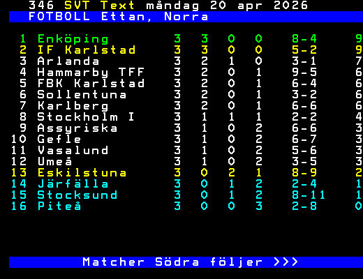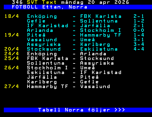 SVT Text Mån 20 Apr. 2026 FOTBOLL Ettan, Norra 18/4 Enköping - FBK Karlsta 2-1 Gefle - Sollentuna 1-2 IF Karlstad - Järfälla 2-1 Arlanda - Stockholm I 0-0 19/4 Piteå - Hammarby TF 1-4 Vasalund - Umeå 3-1 Assyriska - Karlberg 3-4 20/4 Stocksund - Eskilstuna 4-4 24/4 Enköping - Arlanda 25/4 FBK Karlsta - Stocksund Sollentuna - Assyriska 26/4 Stockholm I - Umeå Eskilstuna - IF Karlstad Järfälla - Piteå Karlberg - Gefle 27/4 Hammarby TF - Vasalund Tabell Norra följer >>> +Dela 2 dagar