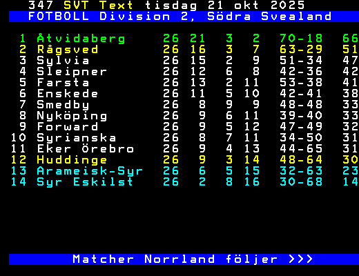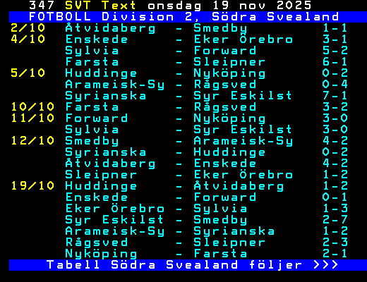 FOTBOLL Division 2, Södra Svealand 2/10 Åtvidaberg - Smedby 1-1 4/10 Enskede - Eker Örebro 3-1 Sylvia - Forward 5-2 Farsta - Sleipner 6-1 5/10 Huddinge - Nyköping 0-2 Arameisk-Sy - Rågsved 0-4 Syrianska - Syr Eskilst 7-1 10/10 Farsta - Rågsved 3-2 11/10 Forward - Nyköping 3-0 Sylvia - Syr Eskilst 3-0 12/10 Smedby - Arameisk-Sy 4-2 Syrianska - Huddinge 0-2 Åtvidaberg - Enskede 4-2 Sleipner - Eker Örebro 1-2 19/10 Huddinge - Åtvidaberg 1-2 Enskede - Forward 0-1 Eker Örebro - Sylvia 1-3 Syr Eskilst - Smedby 2-7 Arameisk-Sy - Syrianska 1-2 Rågsved - Sleipner 2-3 Nyköping - Farsta 2-1 Tabell Södra Svealand följer >>> +Dela 15 dagar