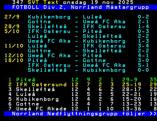 SVT Text Ons 19 Nov. 2025 FOTBOLL Div.2, Norrland Mästargrupp 27/9 Kubikenborg - Luleå 0-2 Gottne - Umeå FC Aka 2-1 28/9 Skellefteå - IFK Östersu 1-4 5/10 IFK Östersu - Piteå 0-3 Luleå - Skellefteå 2-2 Umeå FC Aka - Kubikenborg 1-3 11/10 Luleå - IFK Östersu 3-4 Gottne - Skellefteå 2-2 12/10 Umeå FC Aka - Piteå 4-1 18/10 Piteå - Gottne 3-0 IFK Östersu - Umeå FC Aka 5-1 Skellefteå - Kubikenborg 0-0 1 Piteå 12 9 2 1 29-9 35 2 IFK Östersund 12 7 2 3 25-19 29 3 Skellefteå 12 4 6 2 28-17 22 4 Luleå 12 5 2 5 22-21 19 5 Kubikenborg 12 4 2 6 15-20 16 6 Gottne 12 4 1 7 13-23 13 7 Umeå FC Akade 12 1 1 10 13-36 8 Norrland Nedflyttningsgrupp följer >> +Dela 15 dagar