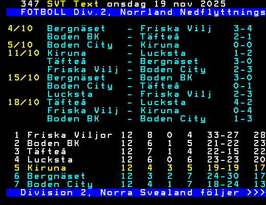 FOTBOLL Div.2, Norrland Nedflyttnings 4/10 Bergnäset - Friska Vilj 3-4 Boden BK - Täfteå 2-1 5/10 Boden City - Kiruna 0-0 11/10 Kiruna - Lucksta 1-2 Täfteå - Bergnäset 3-0 Friska Vilj - Boden City 2-3 15/10 Bergnäset - Boden BK 3-0 Boden City - Täfteå 0-1 Lucksta - Friska Vilj 2-3 18/10 Täfteå - Lucksta 4-2 Friska Vilj - Kiruna 0-4 Boden BK - Boden City 1-3 1 Friska Viljor 12 8 0 4 33-27 28 2 Boden BK 12 6 1 5 21-22 23 3 Täfteå 12 7 1 4 22-15 22 4 Lucksta 12 6 0 6 23-23 20 5 Kiruna 12 4 3 5 19-19 17 6 Bergnäset 12 3 2 7 24-30 17 7 Boden City 12 4 1 7 18-24 13 Division 2, Norra Svealand följer >>> +Dela 15 dagar