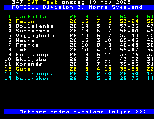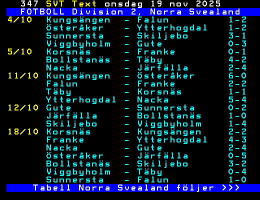 FOTBOLL Division 2, Norra Svealand 4/10 Kungsängen - Falun 1-2 Österåker - Ytterhogdal 1-2 Sunnersta - Skiljebo 3-1 Viggbyholm - Gute 0-3 5/10 Korsnäs - Franke 0-1 Bollstanäs - Täby 4-2 Nacka - Järfälla 2-4 11/10 Kungsängen - Österåker 6-0 Falun - Franke 2-2 Täby - Korsnäs 1-1 Ytterhogdal - Nacka 5-4 12/10 Gute - Sunnersta 0-2 Järfälla - Bollstanäs 1-0 Skiljebo - Viggbyholm 1-4 18/10 Korsnäs - Kungsängen 2-2 Franke - Ytterhogdal 4-3 Nacka - Gute 2-4 Österåker - Järfälla 0-5 Bollstanäs - Skiljebo 3-2 Viggbyholm - Täby 0-4 Sunnersta - Falun 1-0 Tabell Norra Svealand följer >>> +Dela 15 dagar