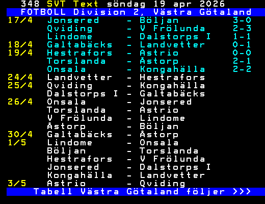 FOTBOLL Division 2, Västra Götaland 17/4 Jonsered - Böljan 3-0 Qviding - V Frölunda 2-3 Lindome - Dalstorps I 1-1 18/4 Galtabäcks - Landvetter 0-1 19/4 Hestrafors - Astrio 0-0 Torslanda - Åstorp 2-1 Onsala - Kongahälla 2-2 24/4 Landvetter - Hestrafors 25/4 Qviding - Kongahälla Dalstorps I - Galtabäcks 26/4 Onsala - Jonsered Torslanda - Astrio V Frölunda - Lindome Åstorp - Böljan 30/4 Galtabäcks - Åstorp 1/5 Lindome - Onsala Böljan - Torslanda Hestrafors - V Frölunda Jonsered - Dalstorps I Kongahälla - Landvetter 3/5 Astrio - Qviding Tabell Västra Götaland följer >>> +Dela 3 dagar