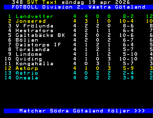FOTBOLL Division 2, Västra Götaland 1 Landvetter 4 4 0 0 8-2 12 2 Jonsered 4 3 1 0 10-4 10 3 V Frölunda 4 2 2 0 8-6 8 4 Hestrafors 4 2 1 1 6-4 7 5 Galtabäcks BK 4 2 0 2 10-6 6 6 Böljan 4 2 0 2 6-7 6 7 Dalstorps IF 4 1 2 1 6-4 5 8 Torslanda 4 1 2 1 5-7 5 9 Lindome 4 1 1 2 5-10 4 10 Qviding 4 1 0 3 10-10 3 11 Kongahälla 4 0 3 1 5-7 3 12 Åstorp 4 1 0 3 5-9 3 13 Astrio 4 0 2 2 2-4 2 14 Onsala 4 0 2 2 3-9 2 Matcher Södra Götaland följer >>> +Dela 3 dagar