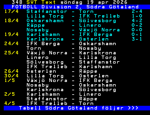 FOTBOLL Division 2, Södra Götaland 17/4 Staffanstor - Torn 2-4 Lilla Torg - IFK Trelleb 1-0 18/4 Oskarshamn - Sölvesborg 4-2 Räppe - Linero 0-2 Nosaby - Växjö Norra 0-0 19/4 Karlshamn - IFK Berga 0-1 Karlskrona - Österlen 3-1 24/4 IFK Berga - Oskarshamn Torn - Nosaby 25/4 Växjö Norra - Karlskrona Linero - Lilla Torg Sölvesborg - Staffanstor IFK Trelleb - Karlshamn 26/4 Österlen - Räppe 30/4 Lilla Torg - Österlen 1/5 Växjö Norra - IFK Berga Nosaby - Oskarshamn Karlskrona - Sölvesborg 2/5 Karlshamn - Linero Staffanstor - Räppe 4/5 IFK Trelleb - Torn Tabell Södra Götaland följer >>> +Dela 3 dagar