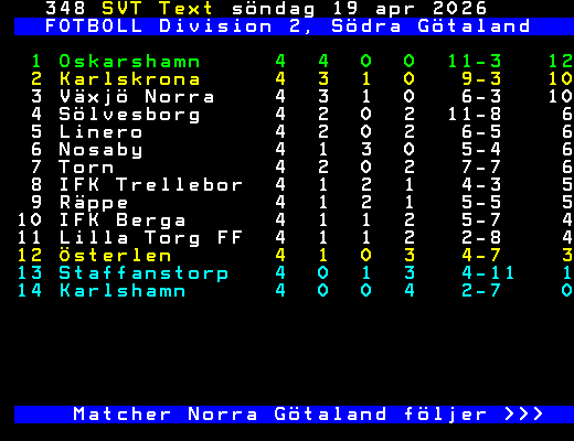 FOTBOLL Division 2, Södra Götaland 1 Oskarshamn 4 4 0 0 11-3 12 2 Karlskrona 4 3 1 0 9-3 10 3 Växjö Norra 4 3 1 0 6-3 10 4 Sölvesborg 4 2 0 2 11-8 6 5 Linero 4 2 0 2 6-5 6 6 Nosaby 4 1 3 0 5-4 6 7 Torn 4 2 0 2 7-7 6 8 IFK Trellebor 4 1 2 1 4-3 5 9 Räppe 4 1 2 1 5-5 5 10 IFK Berga 4 1 1 2 5-7 4 11 Lilla Torg FF 4 1 1 2 2-8 4 12 Österlen 4 1 0 3 4-7 3 13 Staffanstorp 4 0 1 3 4-11 1 14 Karlshamn 4 0 0 4 2-7 0 Matcher Norra Götaland följer >>> +Dela 3 dagar