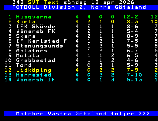 FOTBOLL Division 2, Norra Götaland 1 Husqvarna 4 4 0 0 12-2 12 2 Kumla 4 3 1 0 8-3 10 3 IFK Skövde 4 2 1 1 8-6 7 4 Vänersb FK 4 2 1 1 5-4 7 5 Skara 4 2 1 1 8-9 7 6 IF Karlstad F 4 1 2 1 7-5 5 7 Stenungsunds 4 1 2 1 5-5 5 8 Ahlafors 4 1 2 1 6-7 5 9 Motala 4 1 1 2 6-5 4 10 Grebbestad 4 1 1 2 4-6 4 11 Tord 4 0 3 1 5-9 3 12 Lidköping 4 0 2 2 7-9 2 13 Herrestad 4 0 2 2 7-10 2 14 Vänersb IF 4 0 1 3 5-13 1 Matcher Västra Götaland följer >>> +Dela 3 dagar