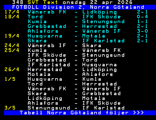 SVT Text Ons 22 Apr. 2026 FOTBOLL Division 2, Norra Götaland 17/4 Vänersb FK - Lidköping 2-1 18/4 Tord - IFK Skövde 0-4 Kumla - Stenungsund 1-1 Grebbestad - Herrestad 2-1 Ahlafors - Vänersb IF 3-0 19/4 Husqvarna - Motala 2-1 Skara - IF Karlstad 2-1 24/4 Vänersb IF - Skara 25/4 Kumla - Vänersb FK IFK Skövde - Stenungsund Grebbestad - Tord IF Karlstad - Husqvarna 26/4 Herrestad - Lidköping Motala - Ahlafors 1/5 Husqvarna - Kumla Tord - Herrestad Vänersb FK - Vänersb IF Skara - Grebbestad Lidköping - Motala Ahlafors - IFK Skövde 3/5 Stenungsund - IF Karlstad Tabell Norra Götaland följer >>> +Dela Igår 13:50