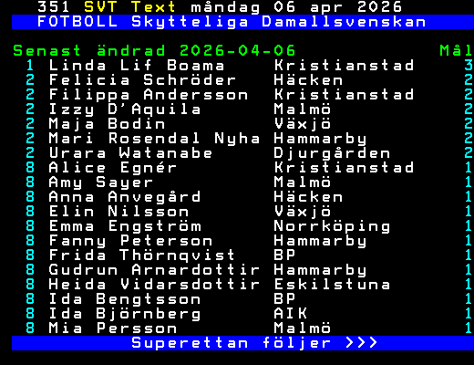 FOTBOLL Skytteliga Damallsvenskan Senast ändrad 2026-04-06 Mål 1 Linda Lif Boama Kristianstad 3 2 Felicia Schröder Häcken 2 2 Filippa Andersson Kristianstad 2 2 Izzy D'Aquila Malmö 2 2 Maja Bodin Växjö 2 2 Mari Rosendal Nyha Hammarby 2 2 Urara Watanabe Djurgården 2 8 Alice Egnér Kristianstad 1 8 Amy Sayer Malmö 1 8 Anna Anvegård Häcken 1 8 Elin Nilsson Växjö 1 8 Emma Engström Norrköping 1 8 Fanny Peterson Hammarby 1 8 Frida Thörnqvist BP 1 8 Gudrun Arnardottir Hammarby 1 8 Heida Vidarsdottir Eskilstuna 1 8 Ida Bengtsson BP 1 8 Ida Björnberg AIK 1 8 Mia Persson Malmö 1 Superettan följer >>> +Dela 16 dagar