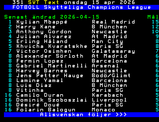 FOTBOLL Skytteliga Champions League Senast ändrad 2026-04-15 Mål 1 Kylian Mbappé Real Madrid 15 2 Harry Kane B München 12 3 Anthony Gordon Newcastle 10 4 Julian Alvarez At Madrid 9 5 Erling Håland Man City 8 5 Khvicha Kvaratskhe Paris SG 8 7 Victor Osimhen Galatasaray 7 8 Alexander Sörloth At Madrid 6 8 Fermin Lopez Barcelona 6 8 Gabriel Martinelli Arsenal 6 8 Harvey Barnes Newcastle 6 8 Jens Petter Hauge Bodö/Glimt 6 8 Lamine Yamal Barcelona 6 8 Luis Diaz B München 6 8 Vitinha Paris SG 6 16 Camilo Duran Karabach 5 16 Dominik Szoboszlai Liverpool 5 16 Désiré Doué Paris SG 5 16 Folarin Balogun Monaco 5 Allsvenskan följer >>> +Dela 7 dagar