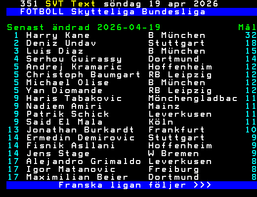 FOTBOLL Skytteliga Bundesliga Senast ändrad 2026-04-19 Mål 1 Harry Kane B München 32 2 Deniz Undav Stuttgart 18 3 Luis Diaz B München 15 4 Serhou Guirassy Dortmund 14 5 Andrej Kramaric Hoffenheim 12 5 Christoph Baumgart RB Leipzig 12 5 Michael Olise B München 12 5 Yan Diomande RB Leipzig 12 9 Haris Tabakovic Mönchengladbac 11 9 Nadiem Amiri Mainz 11 9 Patrik Schick Leverkusen 11 9 Said El Mala Köln 11 13 Jonathan Burkardt Frankfurt 10 14 Ermedin Demirovic Stuttgart 9 14 Fisnik Asllani Hoffenheim 9 14 Jens Stage W Bremen 9 17 Alejandro Grimaldo Leverkusen 8 17 Igor Matanovic Freiburg 8 17 Maximilian Beier Dortmund 8 Franska ligan följer >>> +Dela 3 dagar