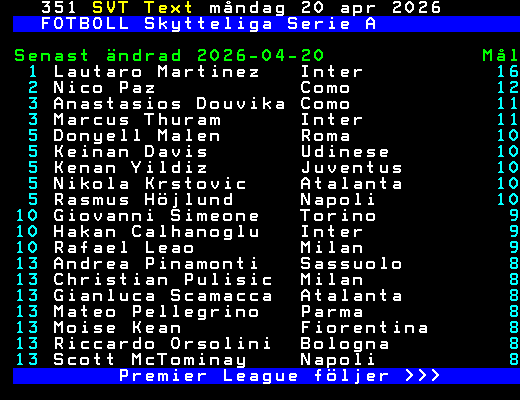 FOTBOLL Skytteliga Serie A Senast ändrad 2026-04-20 Mål 1 Lautaro Martinez Inter 16 2 Nico Paz Como 12 3 Anastasios Douvika Como 11 3 Marcus Thuram Inter 11 5 Donyell Malen Roma 10 5 Keinan Davis Udinese 10 5 Kenan Yildiz Juventus 10 5 Nikola Krstovic Atalanta 10 5 Rasmus Höjlund Napoli 10 10 Giovanni Simeone Torino 9 10 Hakan Calhanoglu Inter 9 10 Rafael Leao Milan 9 13 Andrea Pinamonti Sassuolo 8 13 Christian Pulisic Milan 8 13 Gianluca Scamacca Atalanta 8 13 Mateo Pellegrino Parma 8 13 Moise Kean Fiorentina 8 13 Riccardo Orsolini Bologna 8 13 Scott McTominay Napoli 8 Premier League följer >>> +Dela 2 dagar