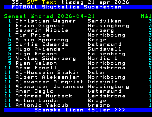 FOTBOLL Skytteliga Superettan Senast ändrad 2026-04-21 Mål 1 Christian Wagner Sandviken 3 1 Ervin Gigovic Helsingborg 3 1 Severin Nioule Varberg 3 1 Tim Prica Norrköping 3 5 Albin Sporrong Brage 2 5 Curtis Edwards Östersund 2 5 Hugo Aviander Sundsvall 2 5 Hugo Komano Falkenberg 2 5 Niklas Söderberg Nordic U 2 5 Ryan Nelson Norrköping 2 11 Adam Egnell Landskrona 1 11 Al-Hussein Shakir Öster 1 11 Albert Aleksanjan Norrköping 1 11 Alexander Almqvist Oddevold 1 11 Alexander Johansso Helsingborg 1 11 Amar Begic Östersund 1 11 Andreas Murbeck Landskrona 1 11 Anton Lundin Brage 1 11 Antonio Yakoub Örebro 1 Spanska ligan följer >>> +Dela 1 dag