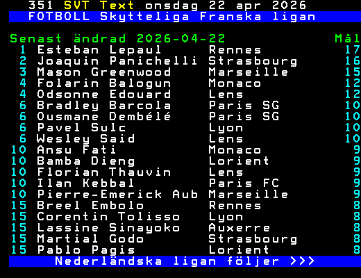 FOTBOLL Skytteliga Franska ligan Senast ändrad 2026-04-22 Mål 1 Esteban Lepaul Rennes 17 2 Joaquin Panichelli Strasbourg 16 3 Mason Greenwood Marseille 15 4 Folarin Balogun Monaco 12 4 Odsonne Edouard Lens 12 6 Bradley Barcola Paris SG 10 6 Ousmane Dembélé Paris SG 10 6 Pavel Sulc Lyon 10 6 Wesley Said Lens 10 10 Ansu Fati Monaco 9 10 Bamba Dieng Lorient 9 10 Florian Thauvin Lens 9 10 Ilan Kebbal Paris FC 9 10 Pierre-Emerick Aub Marseille 9 15 Breel Embolo Rennes 8 15 Corentin Tolisso Lyon 8 15 Lassine Sinayoko Auxerre 8 15 Martial Godo Strasbourg 8 15 Pablo Pagis Lorient 8 Nederländska ligan följer >>> +Dela Igår 21:00