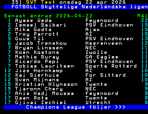 FOTBOLL Skytteliga Nederländska ligan Senast ändrad 2026-04-22 Mål 1 Ayase Ueda Feyenoord 22 2 Ismael Saibari PSV Eindhoven 15 2 Mika Godts Ajax 15 2 Troy Parrott AZ 15 5 Guus Til PSV Eindhoven 13 6 Jacob Trenskow Heerenveen 12 7 Bryan Linssen NEC 11 7 Koen Kostons Zwolle 11 7 Mathis Suray GA Eagles 11 7 Ricardo Pepi PSV Eindhoven 11 7 Tobias Lauritsen Sparta Rotterd 11 12 Jizz Hornkamp AZ 10 12 Kaj Sierhuis For Sittard 10 12 Sven Mijnans AZ 10 15 Kristian Hlynsson Twente 9 15 Tjaronn Chery NEC 9 17 Anis Hadj Moussa Feyenoord 8 17 Daan Rots Twente 8 17 Gjivai Zechiel Utrecht 8 Champions League följer >>> +Dela Igår 22:00