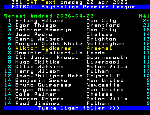 FOTBOLL Skytteliga Premier League Senast ändrad 2026-04-22 Mål 1 Erling Håland Man City 24 2 Igor Thiago Brentford 21 3 Antoine Semenyo Man City 15 4 Joao Pedro Chelsea 14 5 Danny Welbeck Brighton 13 6 Morgan Gibbs-White Nottingham 12 6 Viktor Gyökeres Arsenal 12 8 Dominic Calvert-Le Leeds 11 8 Eli Junior Kroupi Bournemouth 11 8 Hugo Ekitike Liverpool 11 8 Ollie Watkins Aston Villa 11 12 Harry Wilson Fulham 10 12 Jean-Philippe Mate Crystal P 10 14 Benjamin Sesko Man United 9 14 Bruno Guimaraes Newcastle 9 14 Bryan Mbeumo Man United 9 14 Cole Palmer Chelsea 9 14 Morgan Rogers Aston Villa 9 14 Raul Jiménez Fulham 9 Tyska ligan följer >>> +Dela Igår 23:05