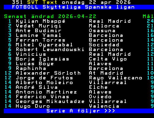FOTBOLL Skytteliga Spanska ligan Senast ändrad 2026-04-22 Mål 1 Kylian Mbappé Real Madrid 24 2 Vedat Muriqi Mallorca 21 3 Ante Budimir Osasuna 16 3 Lamine Yamal Barcelona 16 5 Ferran Torres Barcelona 14 6 Mikel Oyarzabal Sociedad 12 6 Robert Lewandowski Barcelona 12 6 Vinicius Real Madrid 12 9 Borja Iglesias Celta Vigo 11 9 Lucas Boye Alaves 11 9 Raphinha Barcelona 11 12 Alexander Sörloth At Madrid 10 12 Jorge de Frutos Rayo Vallecano 10 14 Alberto Moleiro Villarreal 9 14 André Silva Elche 9 14 Antonio Martinez Alaves 9 14 Federico Vinas Oviedo 9 14 Georges Mikautadze Villarreal 9 14 Hugo Duro Valencia 9 Serie A följer >>> +Dela Igår 23:55