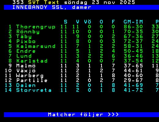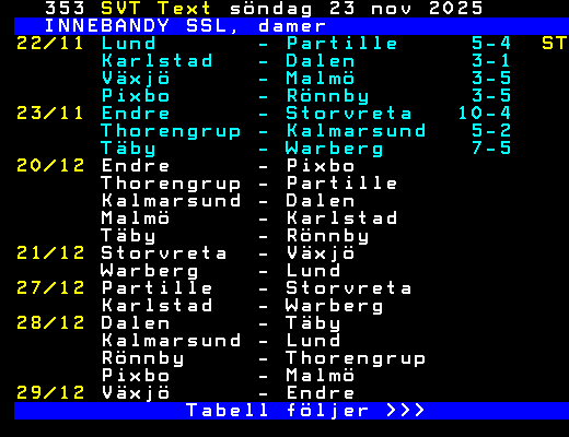 SVT Text Sön 23 Nov. 2025 INNEBANDY SSL, damer 22/11 Lund - Partille 5-4 ST Karlstad - Dalen 3-1 Växjö - Malmö 3-5 Pixbo - Rönnby 3-5 23/11 Endre - Storvreta 10-4 Thorengrup - Kalmarsund 5-2 Täby - Warberg 7-5 20/12 Endre - Pixbo Thorengrup - Partille Kalmarsund - Dalen Malmö - Karlstad Täby - Rönnby 21/12 Storvreta - Växjö Warberg - Lund 27/12 Partille - Storvreta Karlstad - Warberg 28/12 Dalen - Täby Kalmarsund - Lund Rönnby - Thorengrup Pixbo - Malmö 29/12 Växjö - Endre Tabell följer >>> +Dela 10 dagar