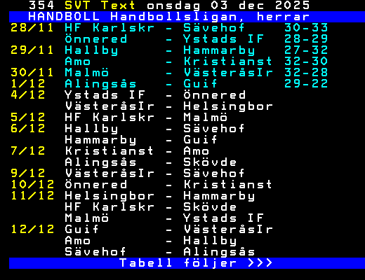 SVT Text Ons 03 Dec. 2025 HANDBOLL Handbollsligan, herrar 28/11 HF Karlskr - Sävehof 30-33 Önnered - Ystads IF 28-29 29/11 Hallby - Hammarby 27-32 Amo - Kristianst 32-30 30/11 Malmö - VästeråsIr 32-28 1/12 Alingsås - Guif 29-22 4/12 Ystads IF - Önnered VästeråsIr - Helsingbor 5/12 HF Karlskr - Malmö 6/12 Hallby - Sävehof Hammarby - Guif 7/12 Kristianst - Amo Alingsås - Skövde 9/12 VästeråsIr - Sävehof 10/12 Önnered - Kristianst 11/12 Helsingbor - Hammarby HF Karlskr - Skövde Malmö - Ystads IF 12/12 Guif - VästeråsIr Amo - Hallby Sävehof - Alingsås Tabell följer >>> +Dela Igår 10:45