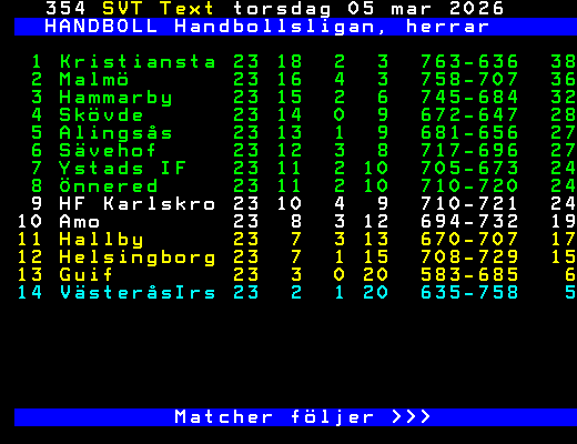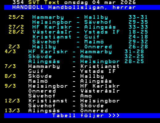 SVT Text Lör 07 Mars 2026 HANDBOLL Handbollsligan, herrar 25/2 Hammarby - Hallby 33-31 Helsingbor - Sävehof 29-35 27/2 HF Karlskr - Alingsås 33-33 28/2 VästeråsIr - Ystads IF 18-25 Kristianst - Guif 24-18 Sävehof - Malmö 29-32 2/3 Hallby - Önnered 26-28 4/3 HF Karlskr - Hammarby 31-28 Skövde - Amo 32-25 Alingsås - Helsingbor 28-25 7/3 Hammarby - Kristianst Guif - Ystads IF 8/3 Skövde - Hallby Malmö - Alingsås 9/3 Helsingbor - HF Karlskr Önnered - VästeråsIr Sävehof - Amo 12/3 Kristianst - Helsingbor Sävehof - Skövde 13/3 Alingsås - Önnered Tabell följer >>> +Dela 2 dagar