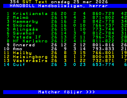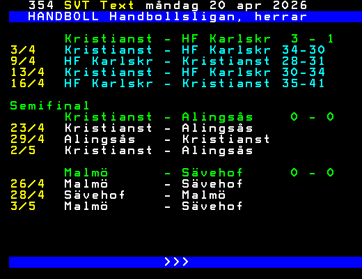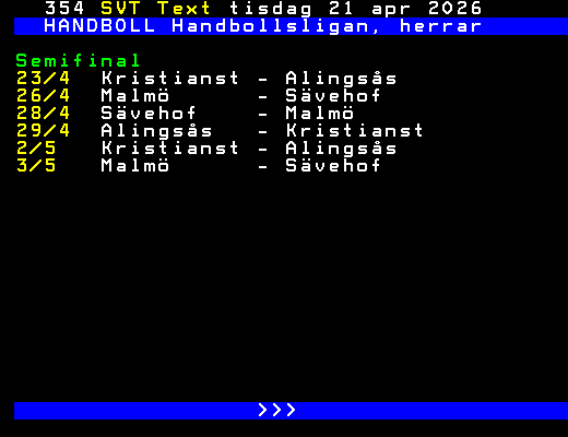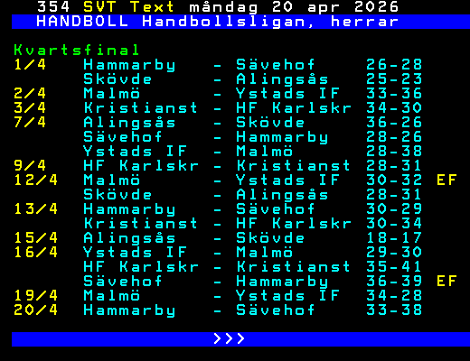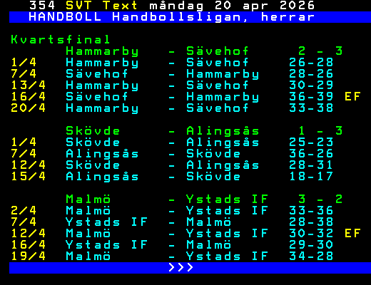 SVT Text Mån 20 Apr. 2026 HANDBOLL Handbollsligan, herrar Kvartsfinal 1/4 Hammarby - Sävehof 26-28 Skövde - Alingsås 25-23 2/4 Malmö - Ystads IF 33-36 3/4 Kristianst - HF Karlskr 34-30 7/4 Alingsås - Skövde 36-26 Sävehof - Hammarby 28-26 Ystads IF - Malmö 28-38 9/4 HF Karlskr - Kristianst 28-31 12/4 Malmö - Ystads IF 30-32 EF Skövde - Alingsås 28-31 13/4 Hammarby - Sävehof 30-29 Kristianst - HF Karlskr 30-34 15/4 Alingsås - Skövde 18-17 16/4 Ystads IF - Malmö 29-30 HF Karlskr - Kristianst 35-41 Sävehof - Hammarby 36-39 EF 19/4 Malmö - Ystads IF 34-28 20/4 Hammarby - Sävehof 33-38 >>> +Dela 2 dagar