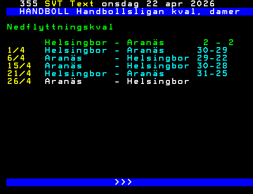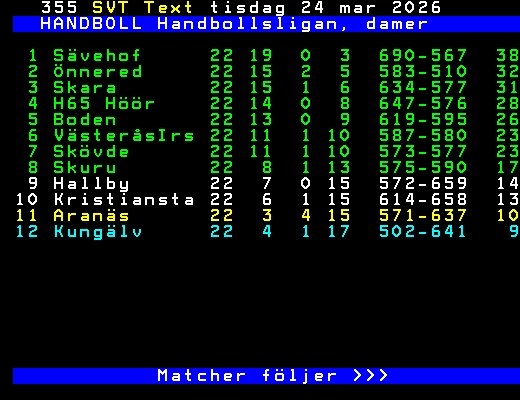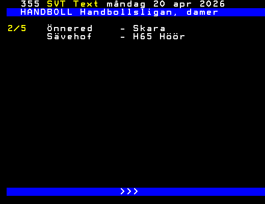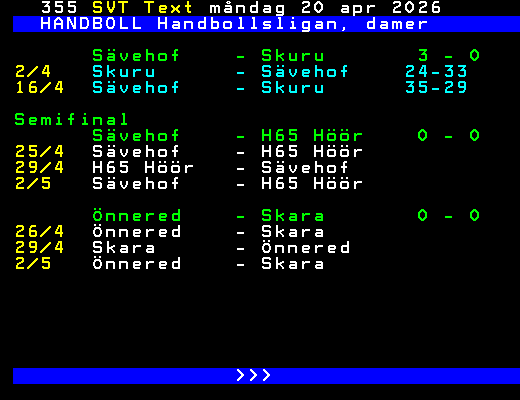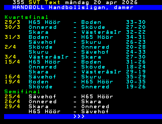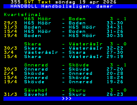 SVT Text Mån 20 Apr. 2026 HANDBOLL Handbollsligan, damer Kvartsfinal 29/3 H65 Höör - Boden 33-30 30/3 Önnered - Skövde 27-20 Skara - VästeråsIr 32-22 31/3 Boden - H65 Höör 34-31 Sävehof - Skuru 26-23 2/4 Skövde - Önnered 20-28 Skuru - Sävehof 24-33 3/4 VästeråsIr - Skara 27-30 15/4 H65 Höör - Boden 31-26 Önnered - Skövde 18-24 Skara - VästeråsIr 29-19 16/4 Sävehof - Skuru 35-29 19/4 Boden - H65 Höör 30-35 Skövde - Önnered 19-26 Semifinal 25/4 Sävehof - H65 Höör 26/4 Önnered - Skara 29/4 Skara - Önnered H65 Höör - Sävehof >>> +Dela 3 dagar