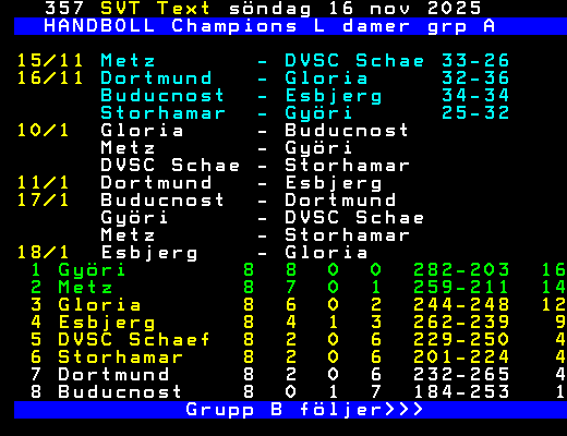 HANDBOLL Champions L damer grp A 15/11 Metz - DVSC Schae 33-26 16/11 Dortmund - Gloria 32-36 Buducnost - Esbjerg 34-34 Storhamar - Györi 25-32 10/1 Gloria - Buducnost Metz - Györi DVSC Schae - Storhamar 11/1 Dortmund - Esbjerg 17/1 Buducnost - Dortmund Györi - DVSC Schae Metz - Storhamar 18/1 Esbjerg - Gloria 1 Györi 8 8 0 0 282-203 16 2 Metz 8 7 0 1 259-211 14 3 Gloria 8 6 0 2 244-248 12 4 Esbjerg 8 4 1 3 262-239 9 5 DVSC Schaef 8 2 0 6 229-250 4 6 Storhamar 8 2 0 6 201-224 4 7 Dortmund 8 2 0 6 232-265 4 8 Buducnost 8 0 1 7 184-253 1 Grupp B följer>>> +Dela 17 dagar