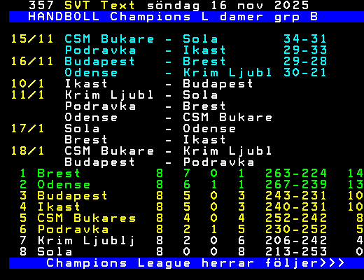 HANDBOLL Champions L damer grp B 15/11 CSM Bukare - Sola 34-31 Podravka - Ikast 29-33 16/11 Budapest - Brest 29-28 Odense - Krim Ljubl 30-21 10/1 Ikast - Budapest 11/1 Krim Ljubl - Sola Podravka - Brest Odense - CSM Bukare 17/1 Sola - Odense Brest - Ikast 18/1 CSM Bukare - Krim Ljubl Budapest - Podravka 1 Brest 8 7 0 1 263-224 14 2 Odense 8 6 1 1 267-239 13 3 Budapest 8 5 0 3 243-231 10 4 Ikast 8 5 0 3 240-231 10 5 CSM Bukares 8 4 0 4 252-242 8 6 Podravka 8 2 1 5 230-252 5 7 Krim Ljublj 8 2 0 6 206-242 4 8 Sola 8 0 0 8 213-253 0 Champions League herrar följer>>> +Dela 17 dagar