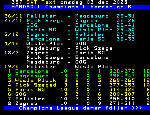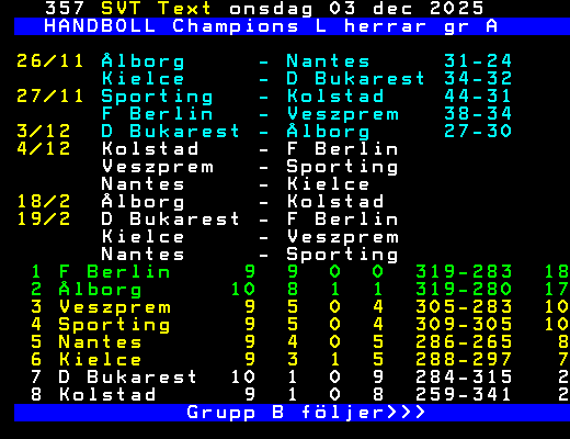 SVT Text Ons 03 Dec. 2025 HANDBOLL Champions L herrar gr A 26/11 Ålborg - Nantes 31-24 Kielce - D Bukarest 34-32 27/11 Sporting - Kolstad 44-31 F Berlin - Veszprem 38-34 3/12 D Bukarest - Ålborg 27-30 4/12 Kolstad - F Berlin Veszprem - Sporting Nantes - Kielce 18/2 Ålborg - Kolstad 19/2 D Bukarest - F Berlin Kielce - Veszprem Nantes - Sporting 1 F Berlin 9 9 0 0 319-283 18 2 Ålborg 10 8 1 1 319-280 17 3 Veszprem 9 5 0 4 305-283 10 4 Sporting 9 5 0 4 309-305 10 5 Nantes 9 4 0 5 286-265 8 6 Kielce 9 3 1 5 288-297 7 7 D Bukarest 10 1 0 9 284-315 2 8 Kolstad 9 1 0 8 259-341 2 Grupp B följer>>> +Dela Igår 20:20