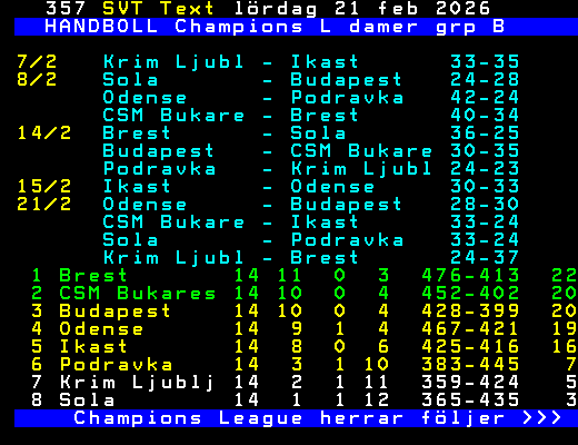 HANDBOLL Champions L damer grp B 7/2 Krim Ljubl - Ikast 33-35 8/2 Sola - Budapest 24-28 Odense - Podravka 42-24 CSM Bukare - Brest 40-34 14/2 Brest - Sola 36-25 Budapest - CSM Bukare 30-35 Podravka - Krim Ljubl 24-23 15/2 Ikast - Odense 30-33 21/2 Odense - Budapest 28-30 CSM Bukare - Ikast 33-24 Sola - Podravka 33-24 Krim Ljubl - Brest 24-37 1 Brest 14 11 0 3 476-413 22 2 CSM Bukares 14 10 0 4 452-402 20 3 Budapest 14 10 0 4 428-399 20 4 Odense 14 9 1 4 467-421 19 5 Ikast 14 8 0 6 425-416 16 6 Podravka 14 3 1 10 383-445 7 7 Krim Ljublj 14 2 1 11 359-424 5 8 Sola 14 1 1 12 365-435 3 Champions League herrar följer >>> +Dela 60 dagar