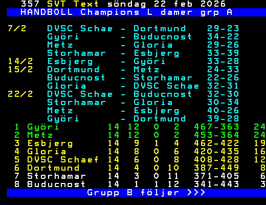 HANDBOLL Champions L damer grp A 7/2 DVSC Schae - Dortmund 29-23 Györi - Buducnost 34-22 Metz - Gloria 29-26 Storhamar - Esbjerg 33-39 14/2 Esbjerg - Györi 33-28 15/2 Dortmund - Metz 24-33 Buducnost - Storhamar 22-26 Gloria - DVSC Schae 32-31 22/2 DVSC Schae - Buducnost 32-30 Storhamar - Gloria 30-34 Metz - Esbjerg 40-26 Györi - Dortmund 39-28 1 Györi 14 12 0 2 467-363 24 2 Metz 14 12 0 2 453-364 24 3 Esbjerg 14 9 1 4 462-422 19 4 Gloria 14 8 0 6 420-435 16 5 DVSC Schaef 14 6 0 8 408-428 12 6 Dortmund 14 4 0 10 387-449 8 7 Storhamar 14 3 0 11 371-405 6 8 Buducnost 14 1 1 12 341-443 3 Grupp B följer >>> +Dela 59 dagar